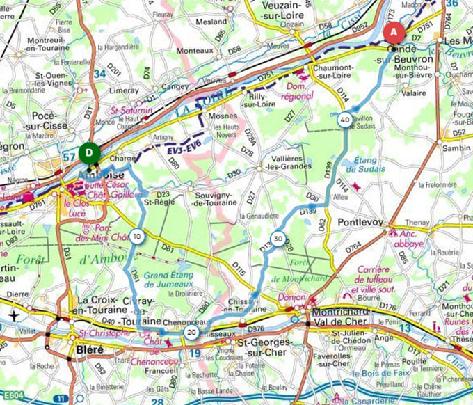 - Prendre à gauche quai des violettes, A gauche rue du clos de belle roche, A droite rue des blaisis, A gauche rue des têtes noires, A droite route chargé à SAINT REGLE, SAINT REGLE, A gauche route de juscors, A gauche rue du petit bois, A gauche rue d’Amboise, CHENONCEAUX, A gauche rue de la fontaine des prés, A gauche – à droite rue de l’Europe, CHISSEAUX, A droite-à gauche, Longer la Loire (rue de la plage), A gauche (arrivée sur D 40), A droite puis à gauche, A droite rue des justices, A gauche route de Chisseaux, Direction CHISSAY EN TOURAINE, A gauche rue basse, Direction D115 – à droite sur la D115- à gauche, A gauche route de Vallières, A droite rue le clos rosiers, A gauche route de sudais, Forêt : route de Chaumont, 1ére à droite après la forêt, Arrivée au camping.
