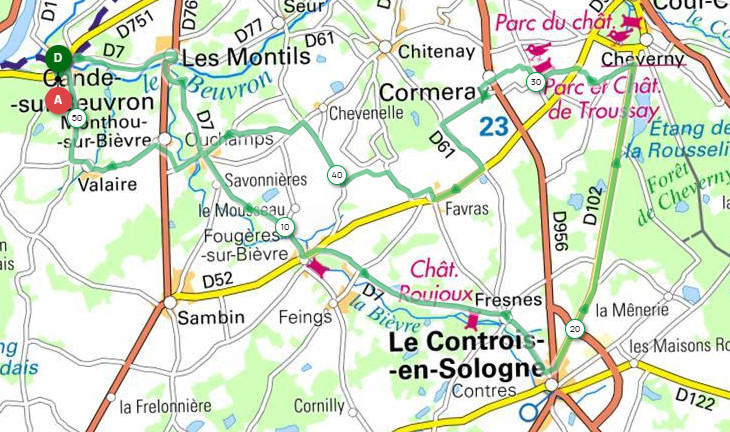 Circuit Sologne-52, 52km, Dénivelée 252m, ID Open-Runner : ID : 23244722 Départ camping D : D751 D : rue des belliéres G :rejoindre D751 traverser le beuvron 1ére D : rte des montils arrivée à la D764 prendre à droite on retraverse le beuvron laisser la D764 G : rue du gué aux loups tout droit RD7 FOUGERES S/ BRIEVRE G : D52 rue henri goyer D : rte de bellyviéres FRESNES arrivée à CONTRES G : rue jules antoinet arrivée D675A D : direction D102 forêt laisser la D102 G : rte de poely traverser la D52 G : et 1ére D : rte de troussay D : voie de la rue colin G : rue de la guillonniére arrivée à la D956 G : et 1ére D : rue de la noue G :puis D : rue de malabry G : rte de la marniére arrivée D52 D : D52 direction FAVRAS D : rue du petit bois D : rte du peu G : puis D : rte de chitenay G : rue des souchettes G :rte de le piochone D : rte de la bosse direction OUCHAMPS D : et G : rue du vieux moulin D : rue de souriou G : rue de valaire retour rue st marc rue de l’octroi rte de candé retour camping