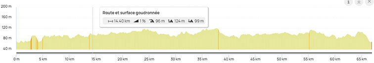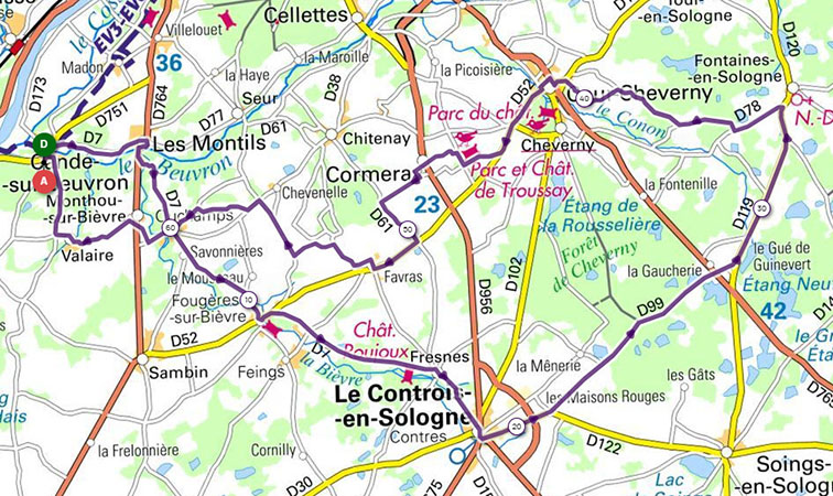 Circuit Fontaine-En-Sologne 67km, Dénivelée 418m, ID Open-Runner : ID : 22814636 Camping Drte , tout droit, D751,aprés le Beuvron Drte D7 les Montils, Drte D764 , puis G D7 Ouchamps,Fougéres sur B, Contres,Drte D675A,G dir Selles,puis G rue Berthin,puis D122 dir Mur de Sologne, G D99 , D119,Fontaines en S,puis Drte D78 drte circuit cycliste Cheverny, Cour Cheverny, au feu G piste cyclable et G suivre circuit 5 ,D52 dir Sambin puis Drte Troussay,Cormeray, D61, le caillou,Drte D52 Drte le petit bois,la tranquilité suivre circuit 3,Ouchamps,G C18 Monthou sur B,D D169, Valaire,Drte Candé G et G ,Camping,,